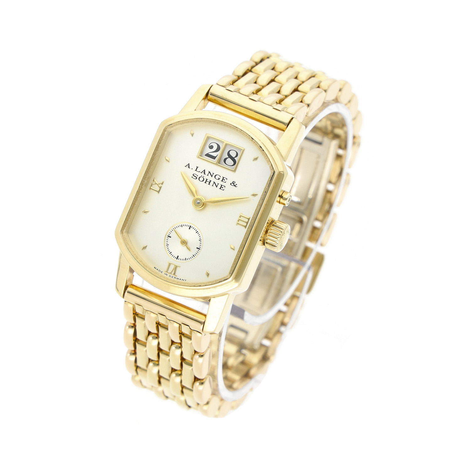 A. Lange Söhne Arkade aus dem Jahre 1997 mit einem 22 x 36mm Gehäuse in Gelbgold und Doppelfaltschließe. Die Damen A. Lange Söhne Uhr befindet sich in einem sehr guten Zustand.