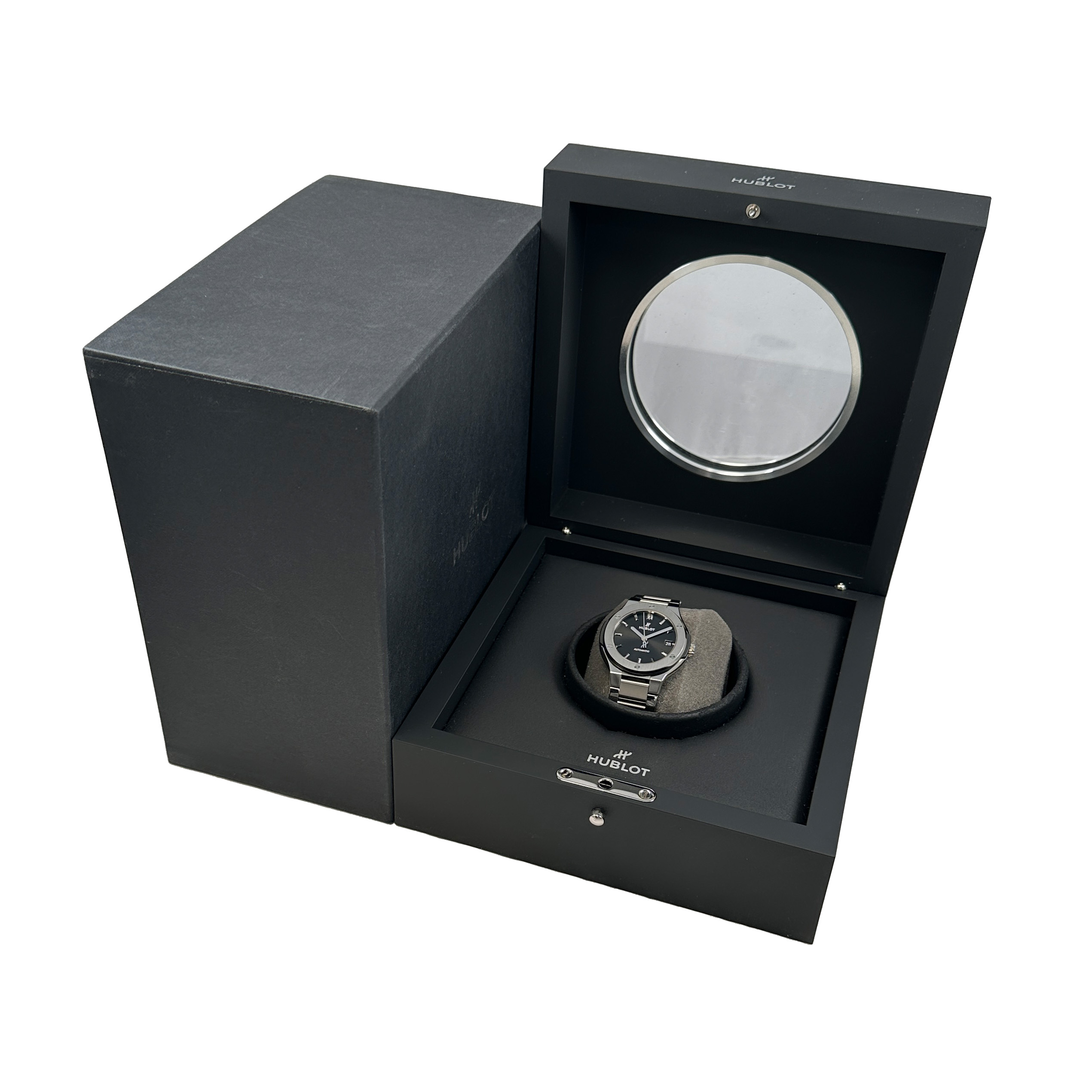 Hublot aus dem Jahre 2022 mit einem 38mm Gehäuse in Titan und Faltschließe. Die Unisex Hublot Uhr befindet sich in einem sehr guten Zustand.