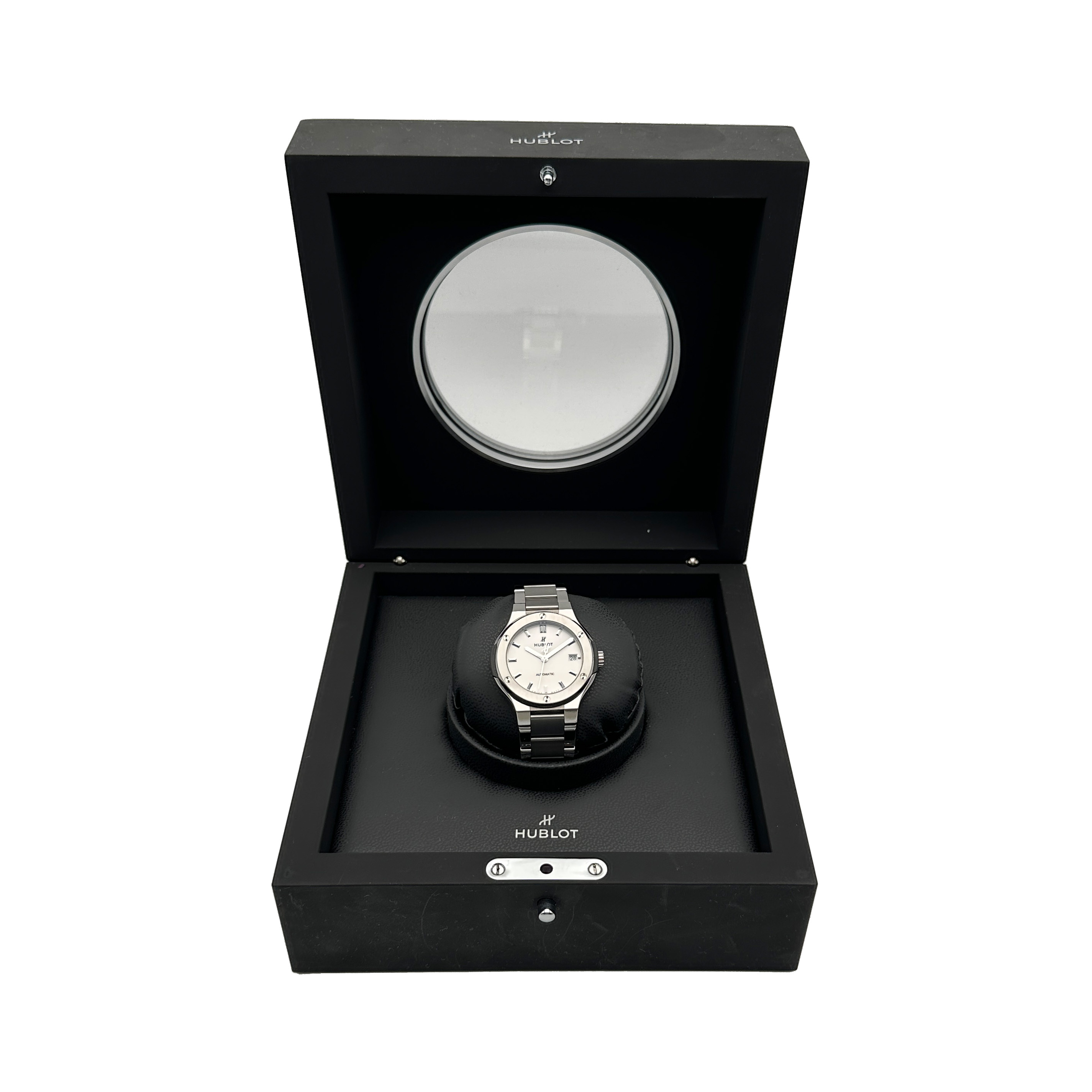 Hublot mit einem 38mm Gehäuse in Titan und Faltschließe. Die Herren Hublot Uhr befindet sich in einem sehr guten Zustand.