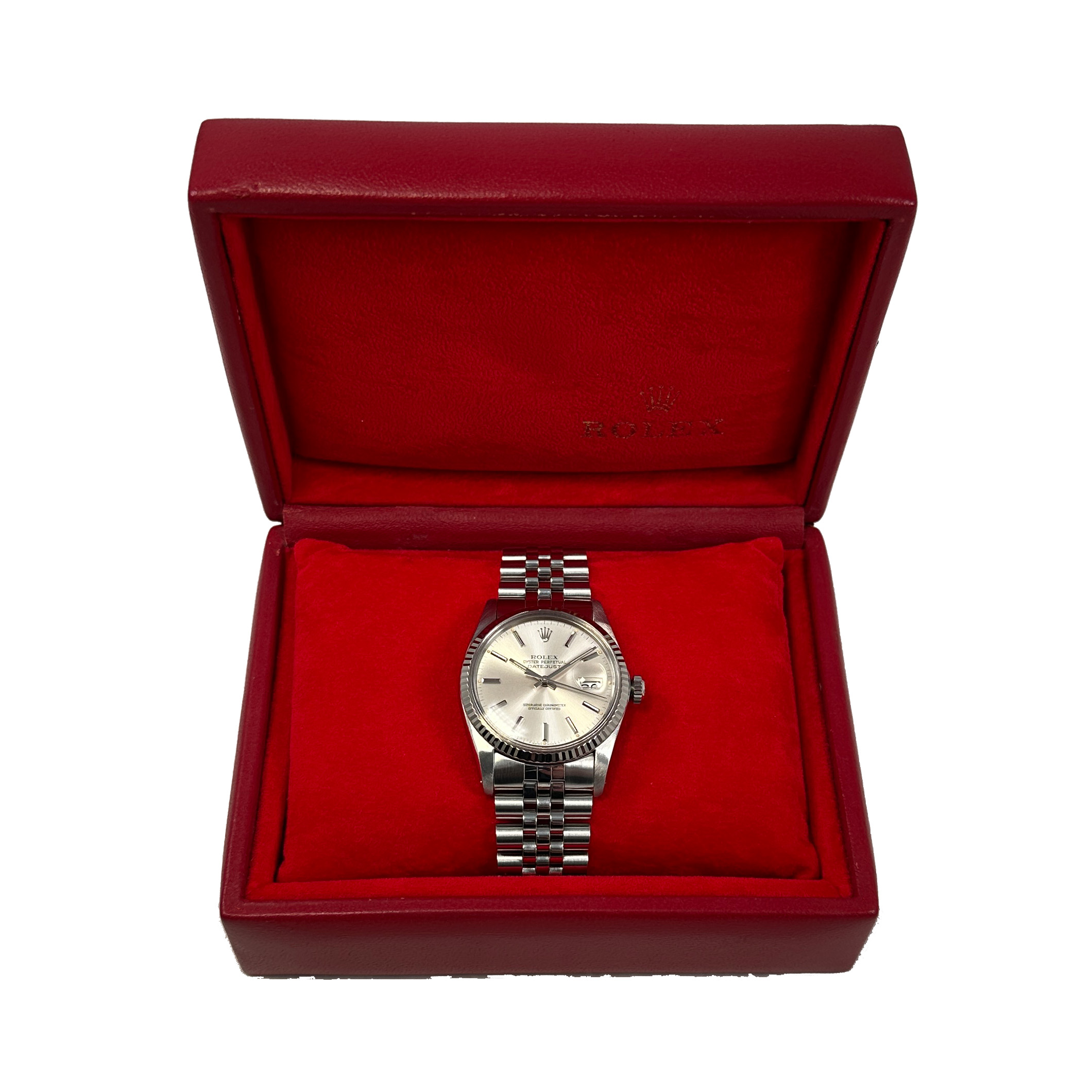 Rolex Datejust aus dem Jahre ca. 1984 mit einem 36mm Gehäuse in Edelstahl und Faltschließe. Die Unisex Rolex Uhr befindet sich in einem sehr guten Zustand.