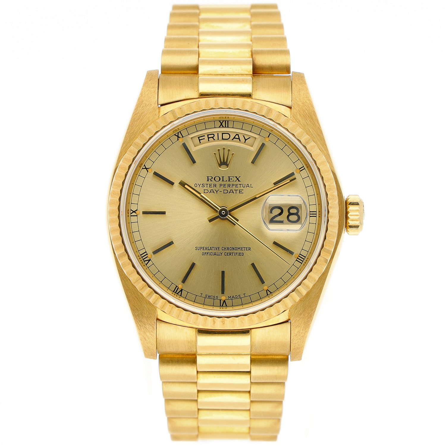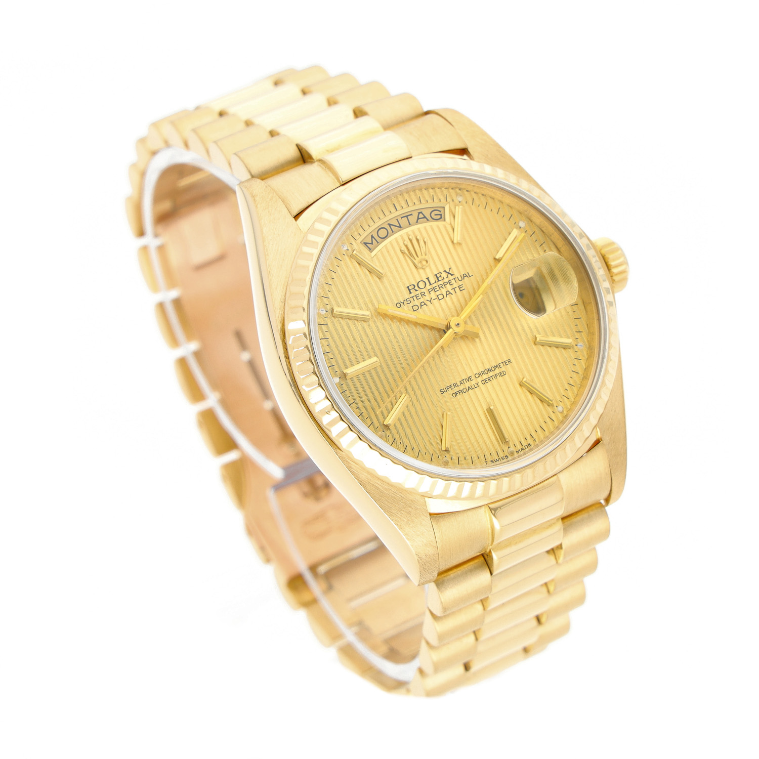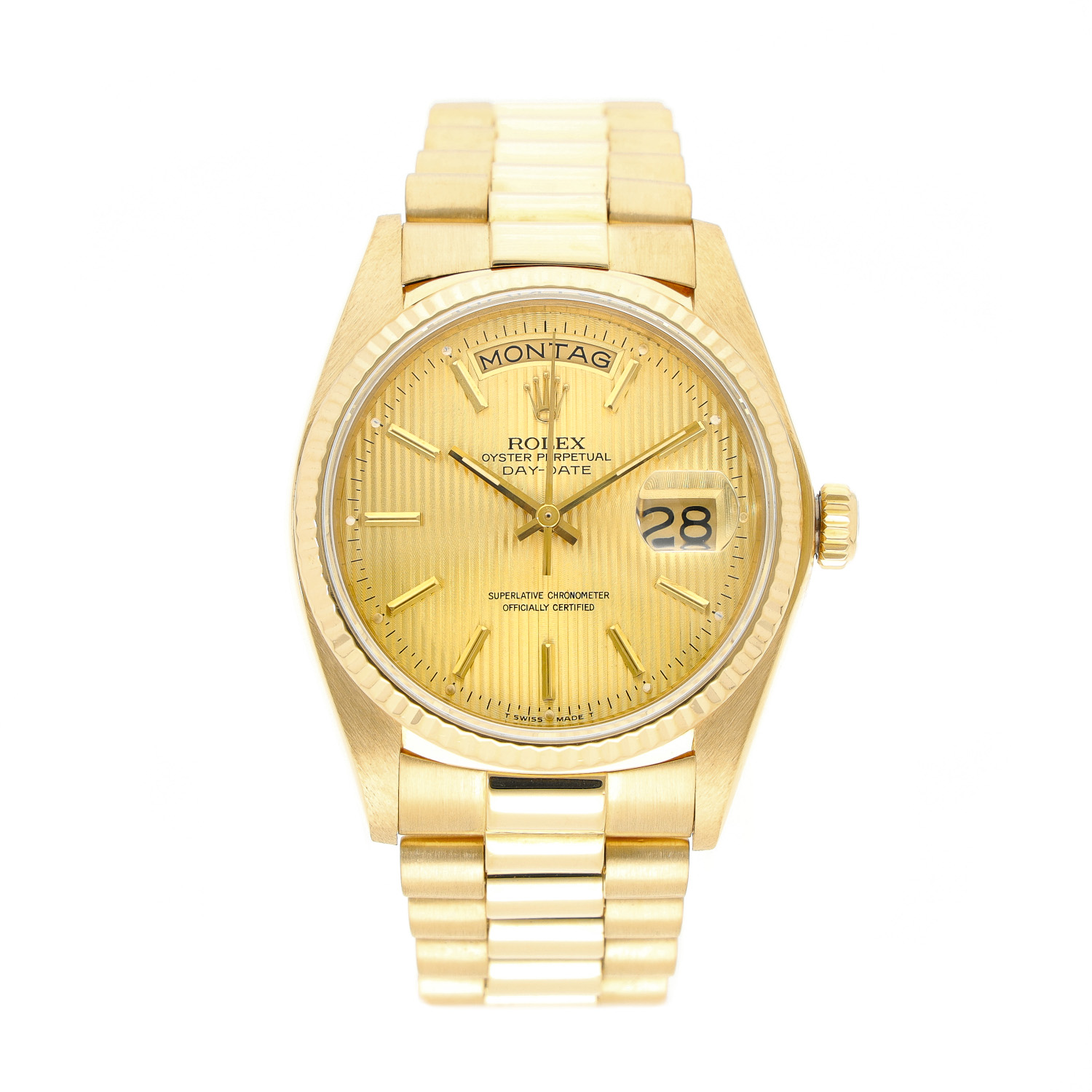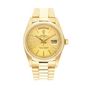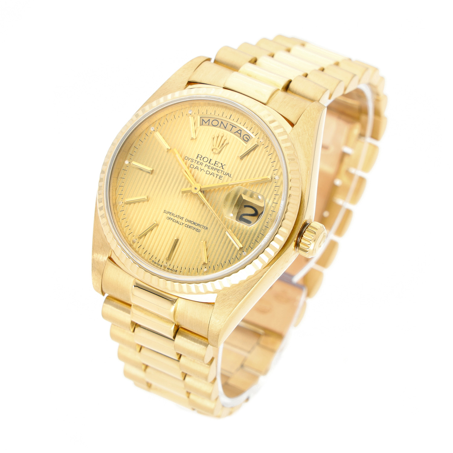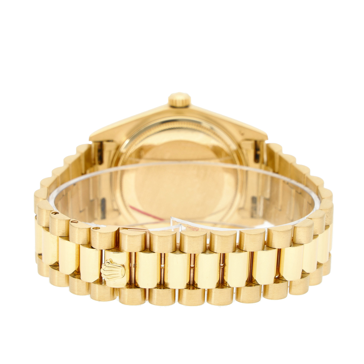 Rolex Day-Date aus dem Jahre 1981 mit einem 36mm Gehäuse in Gelbgold und Faltschließe. Die Herren Rolex Uhr befindet sich in einem sehr guten Zustand.