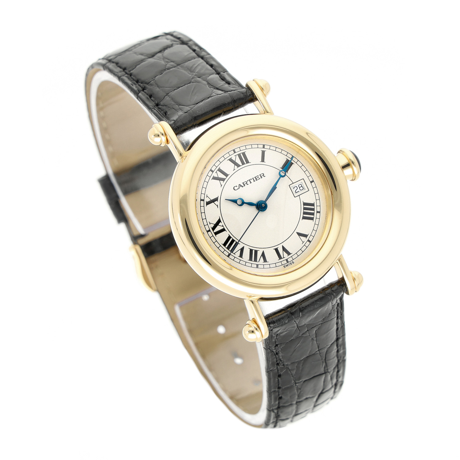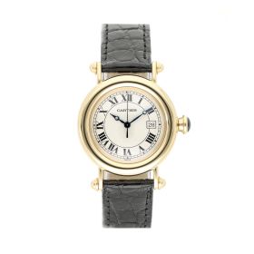 Cartier Diabolo aus dem Jahre 1999 mit einem 32mm Gehäuse in Gelbgold und Dornschließe. Die Herren Cartier Uhr befindet sich in einem sehr guten Zustand.