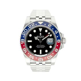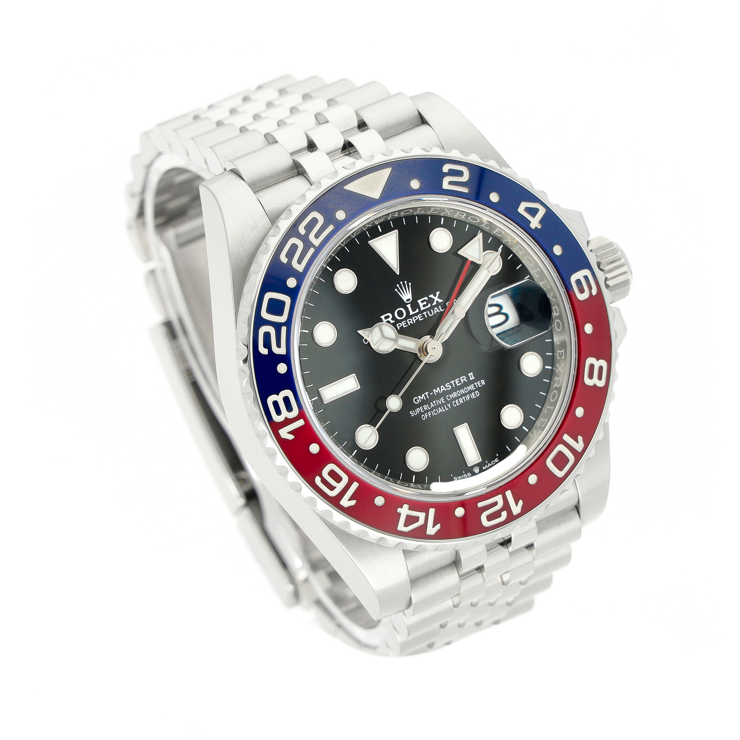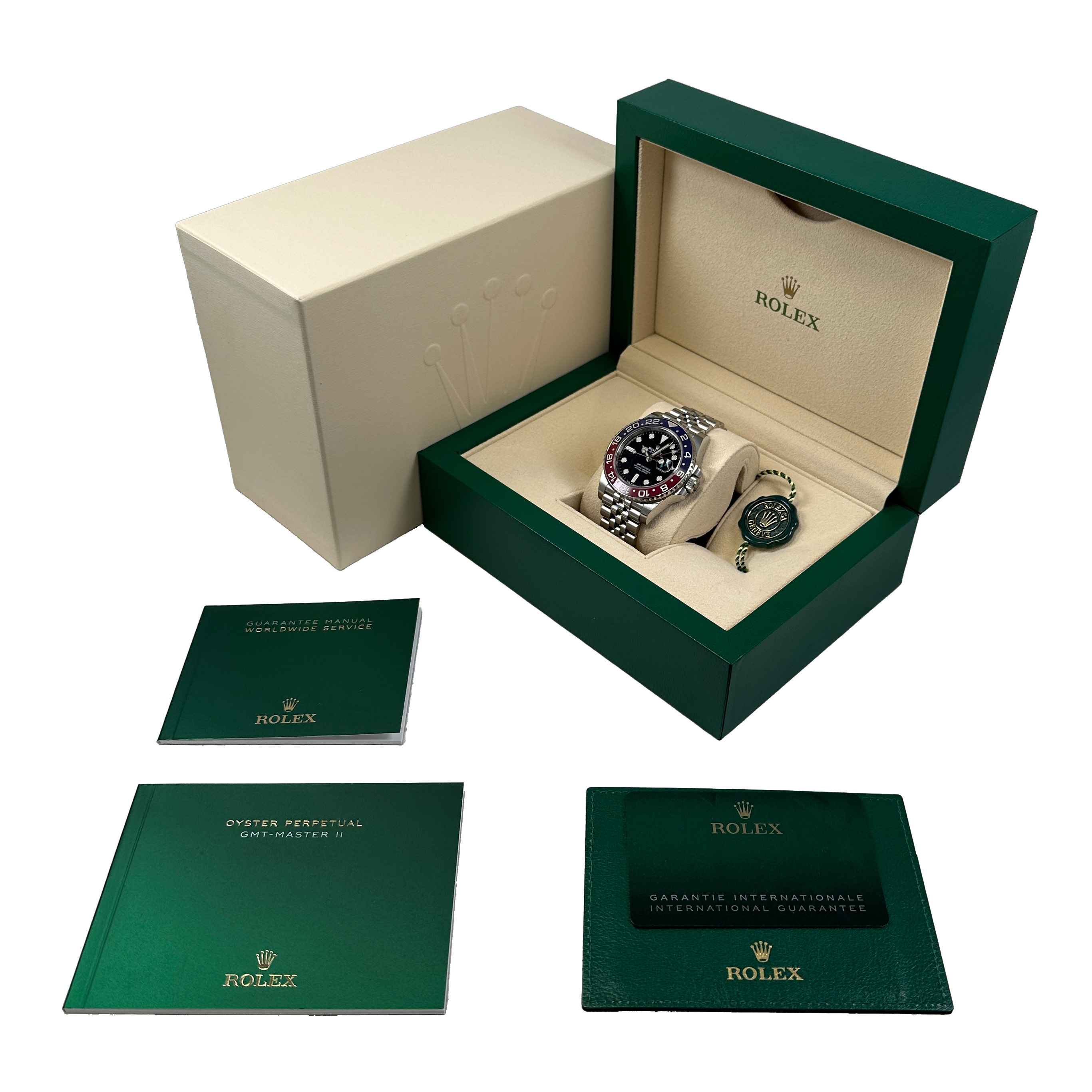 Rolex GMT-Master II aus dem Jahre 2022 mit einem 40mm Gehäuse in Edelstahl und Faltschließe. Die Herren Rolex Uhr befindet sich in einem sehr guten Zustand.