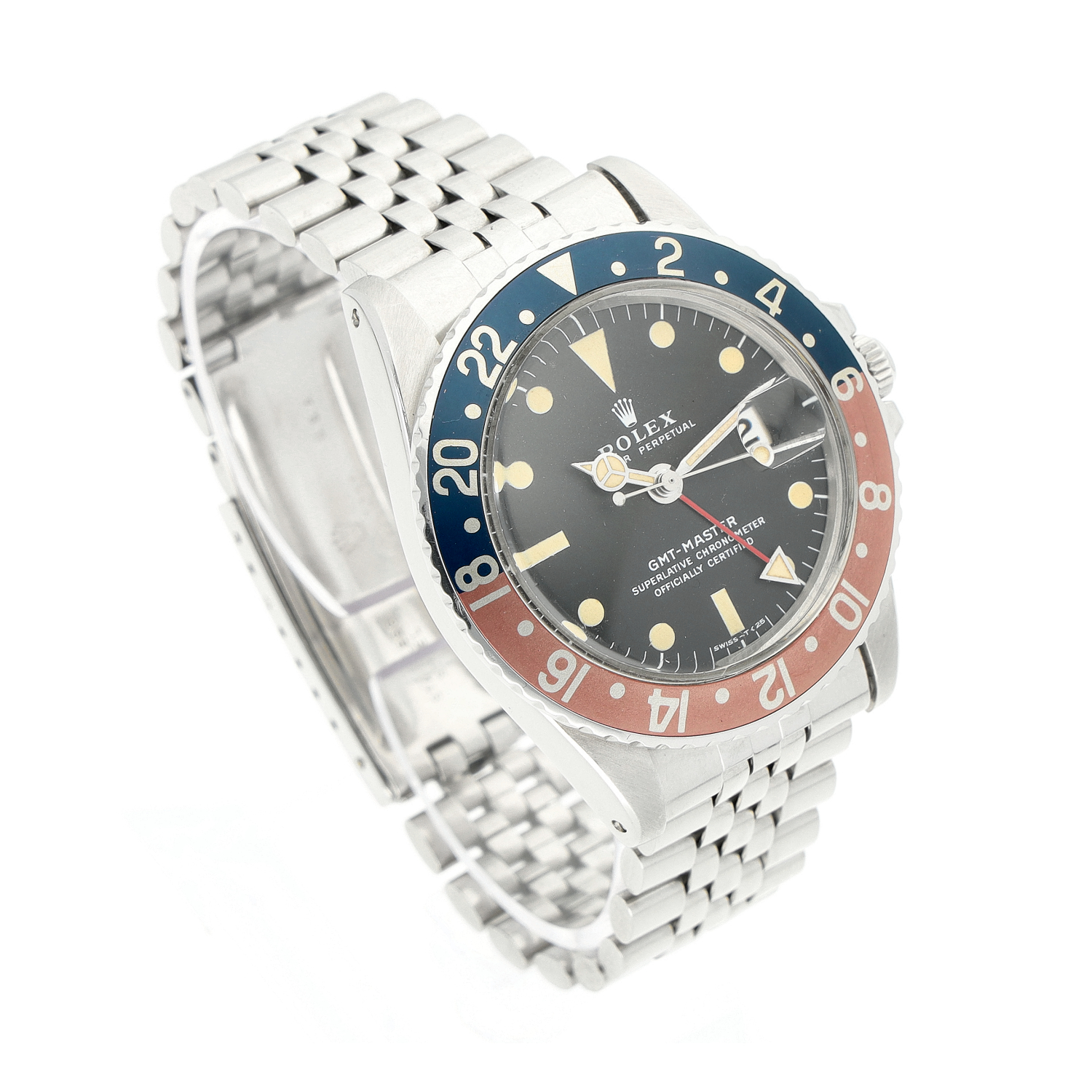 Rolex GMT-Master aus dem Jahre 1973 mit einem 40mm Gehäuse in Edelstahl und Faltschließe. Die Herren Rolex Uhr befindet sich in einem sehr guten Zustand.
