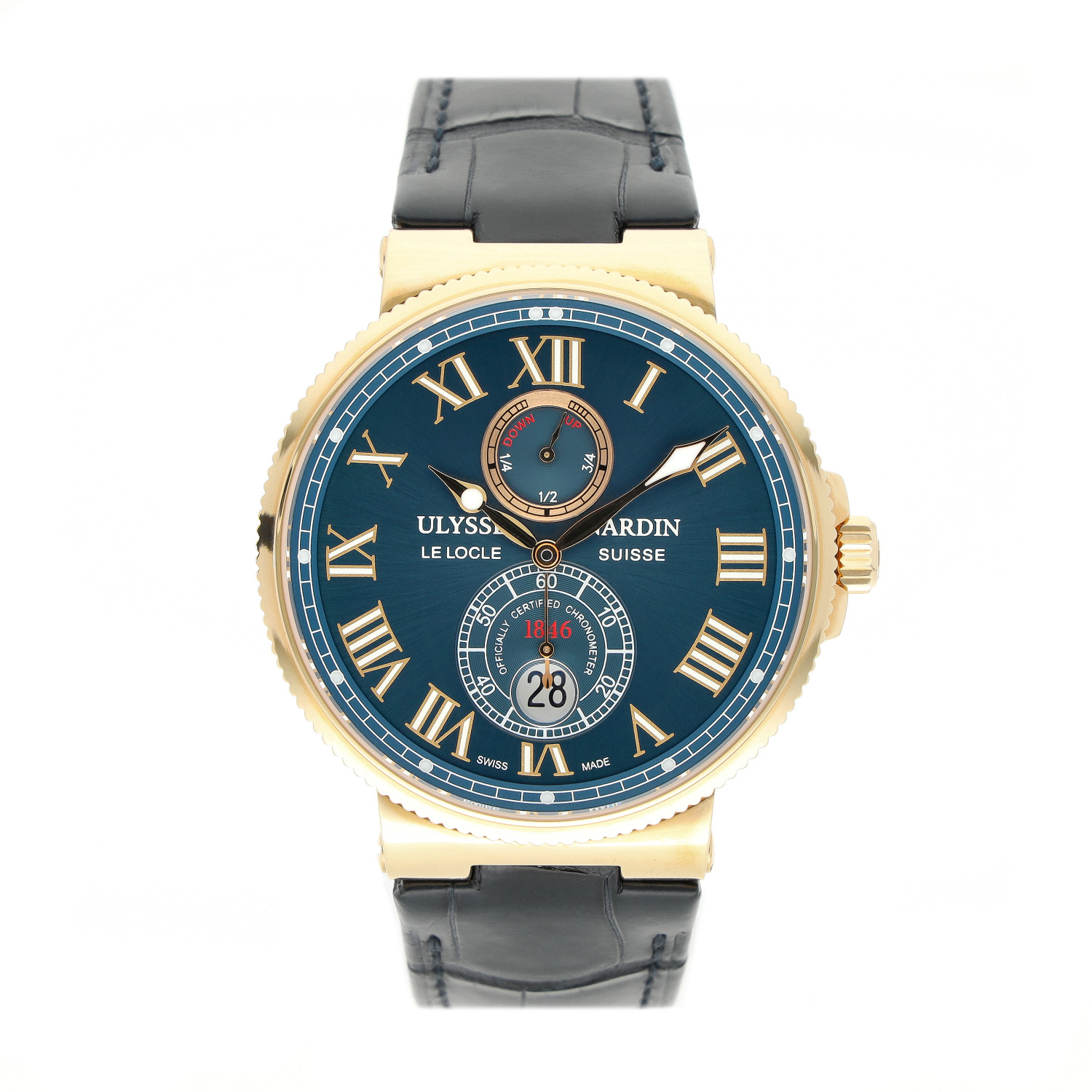 Ulysse Nardin Marine Chronometer aus dem Jahre 2011 mit einem 43mm Gehäuse in Gelbgold und Doppelfaltschließe. Die Herren Ulysse Nardin Uhr befindet sich in einem ungetragenem Zustand.