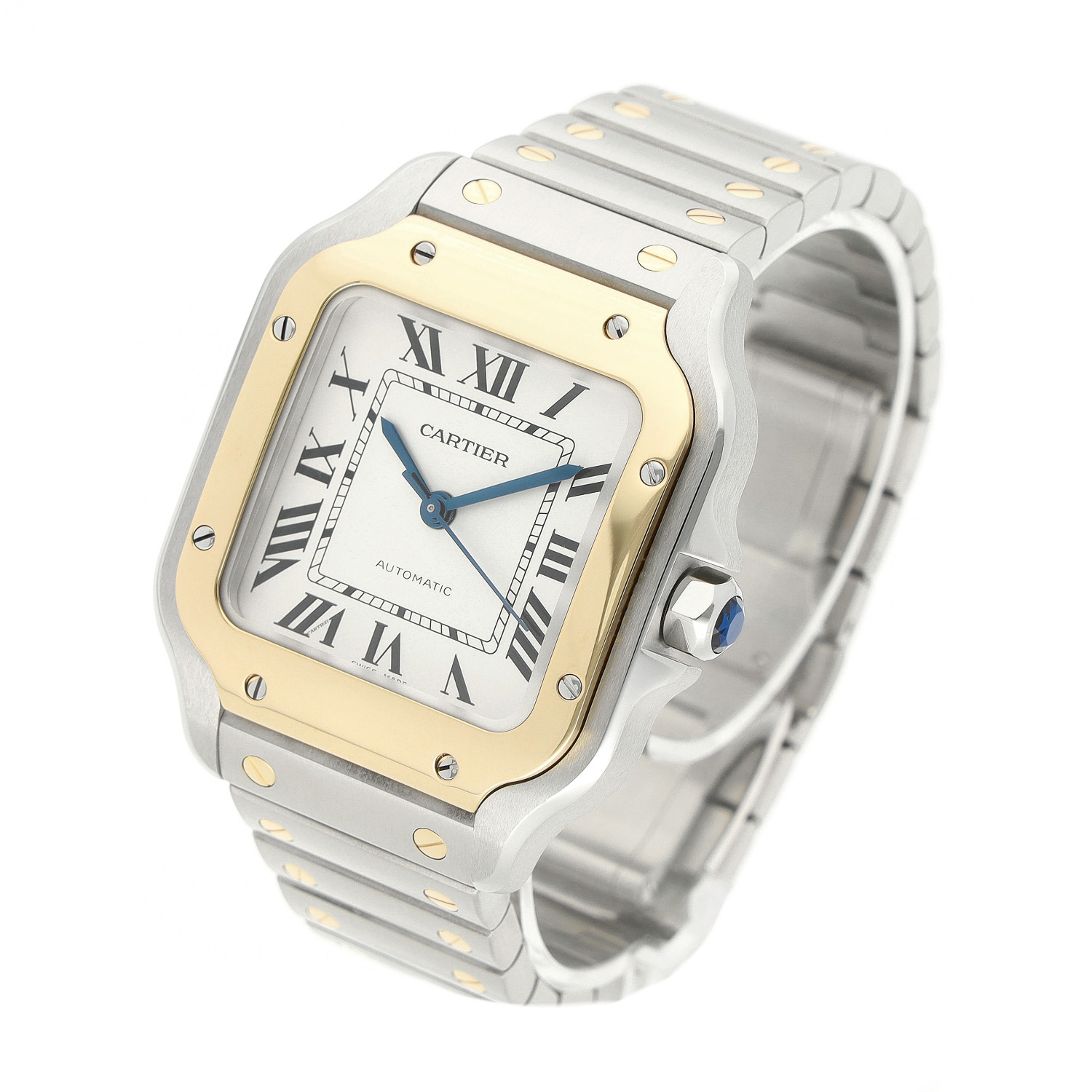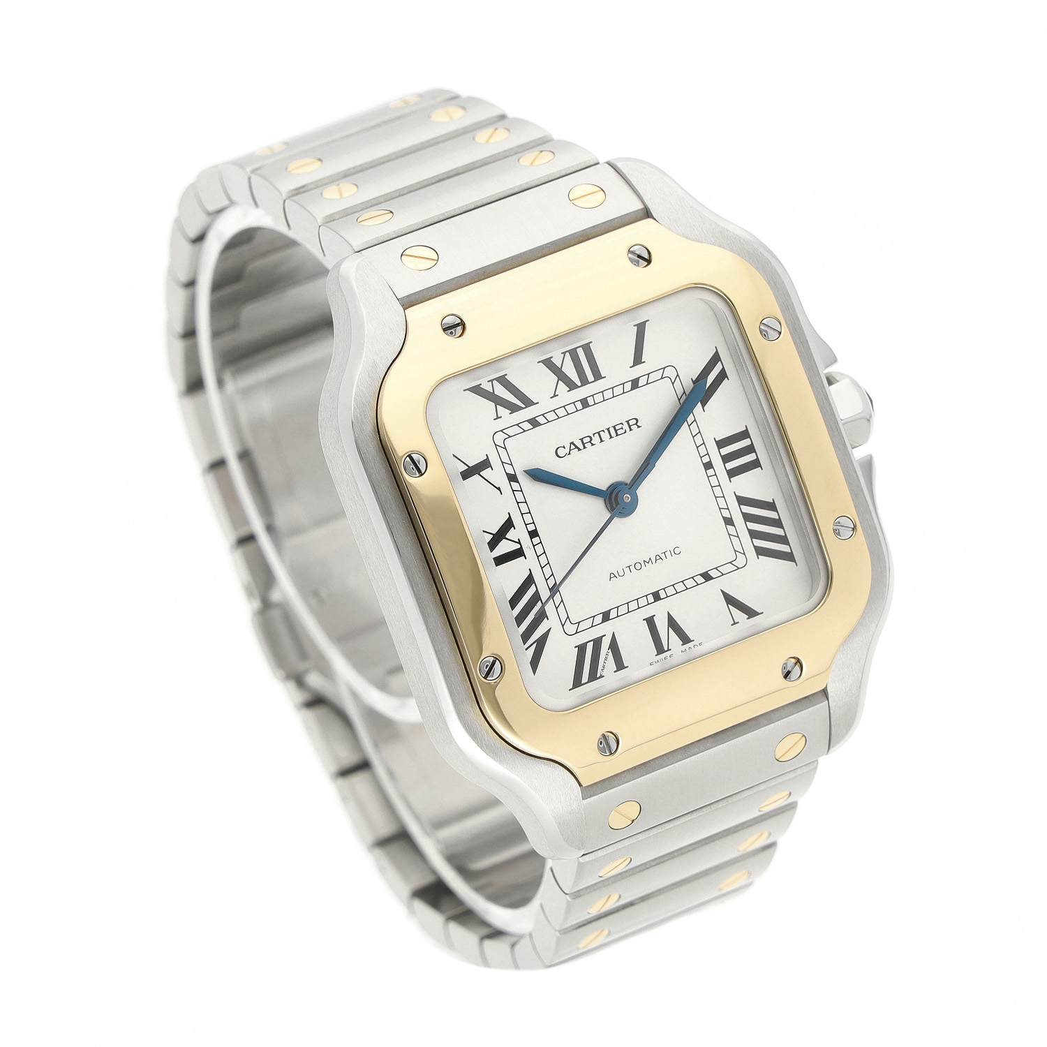 Cartier Santos aus dem Jahre 2021 mit einem 35.1 x 41.9mm Gehäuse in Gold/Stahl und Doppelfaltschließe. Die Herren Cartier Uhr befindet sich in einem sehr guten Zustand.