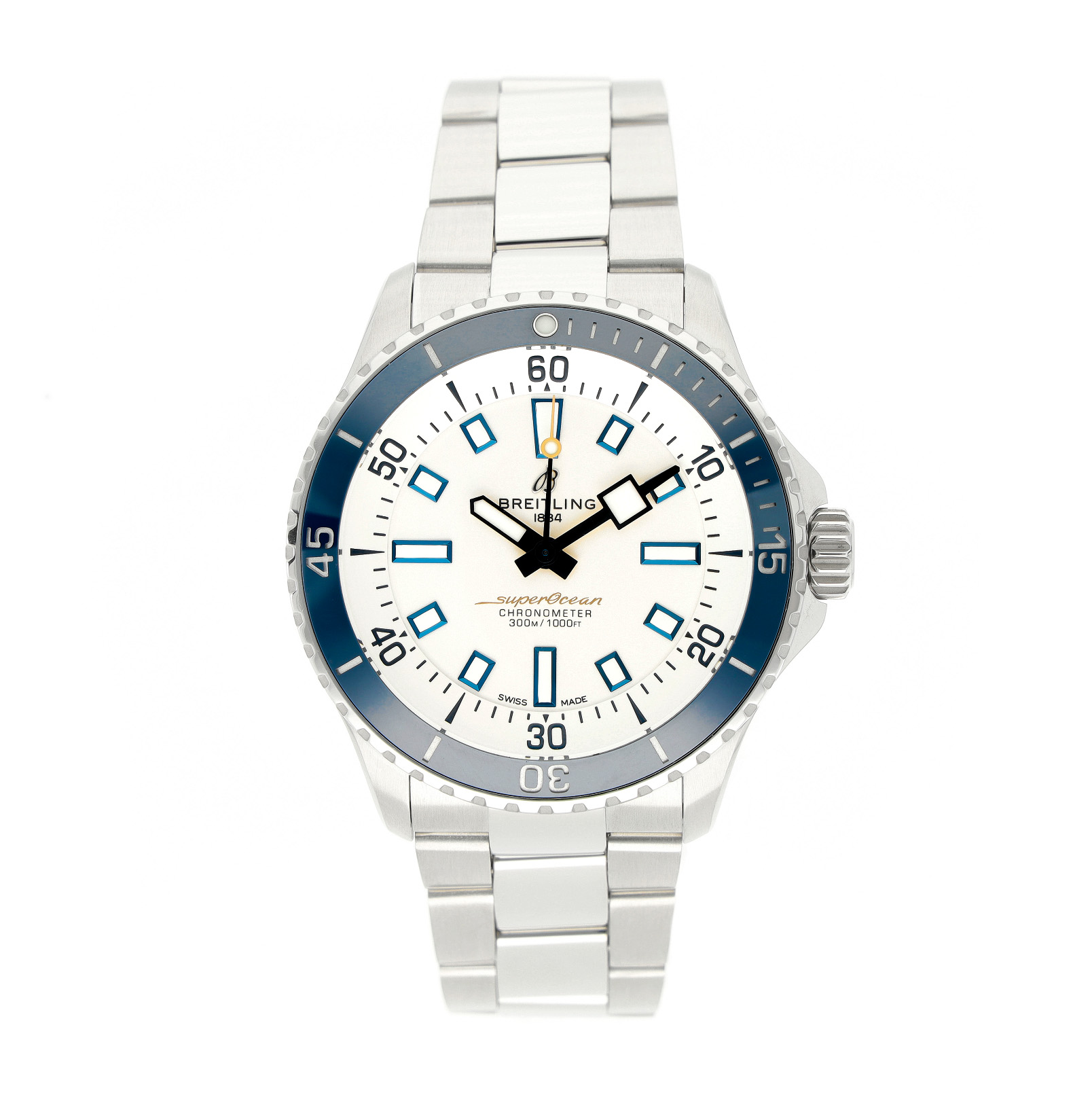 Breitling SuperOcean aus dem Jahre 2023 mit einem 44mm Gehäuse in Edelstahl und Faltschließe. Die Herren Breitling Uhr befindet sich in einem sehr guten Zustand.